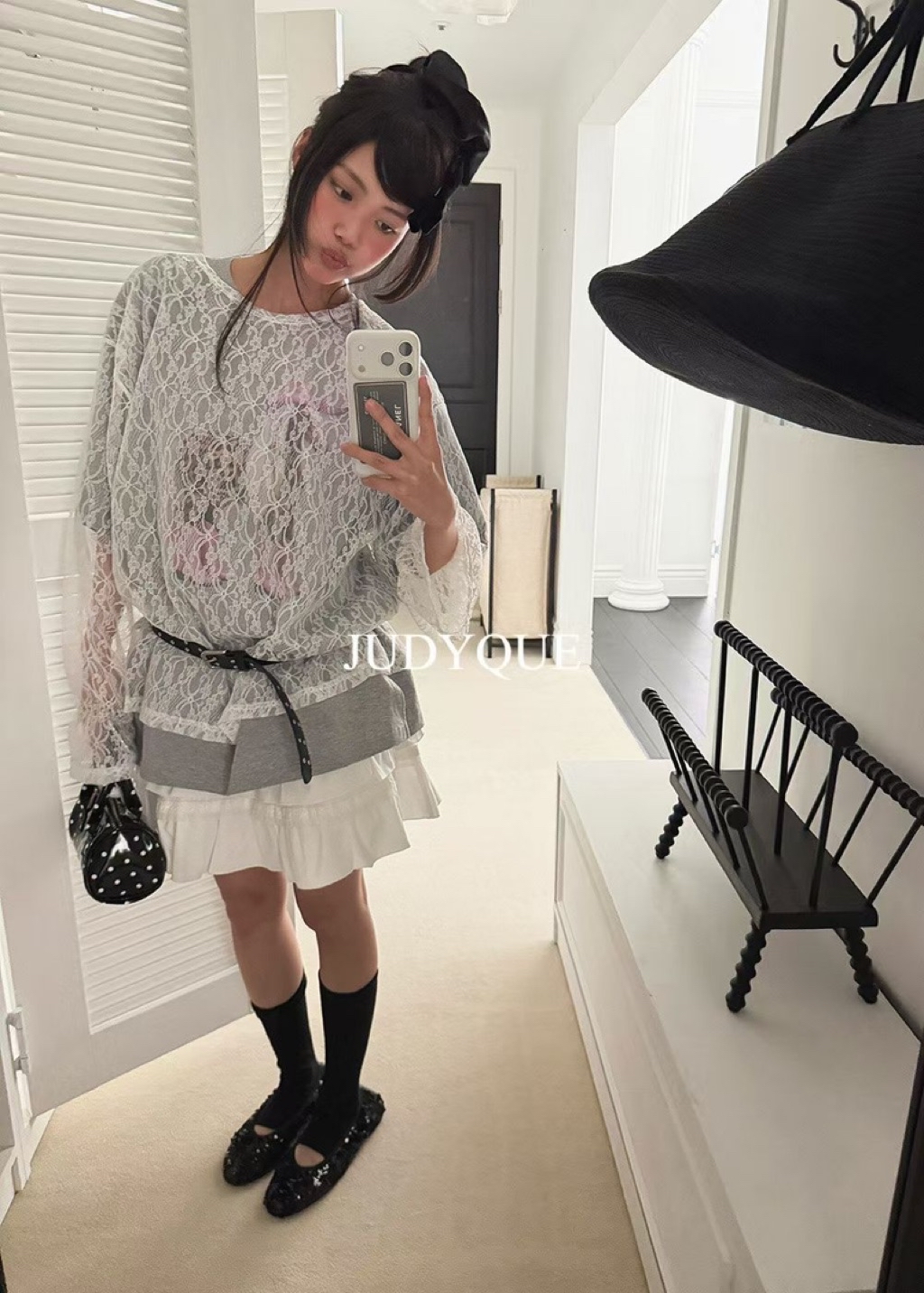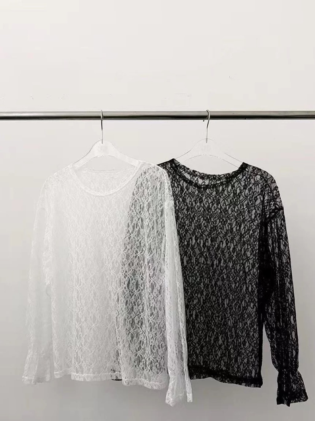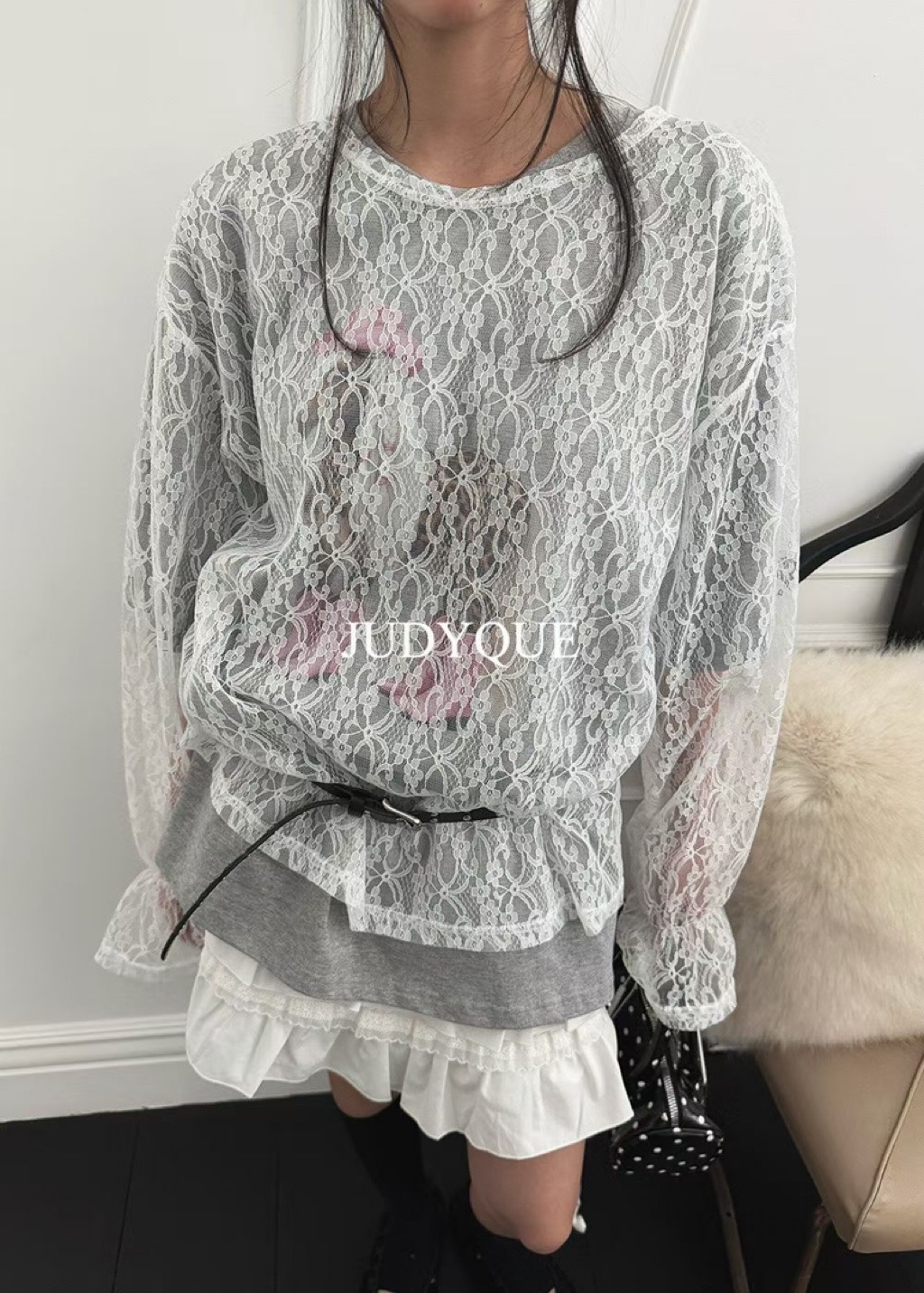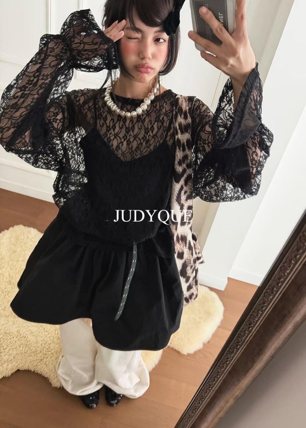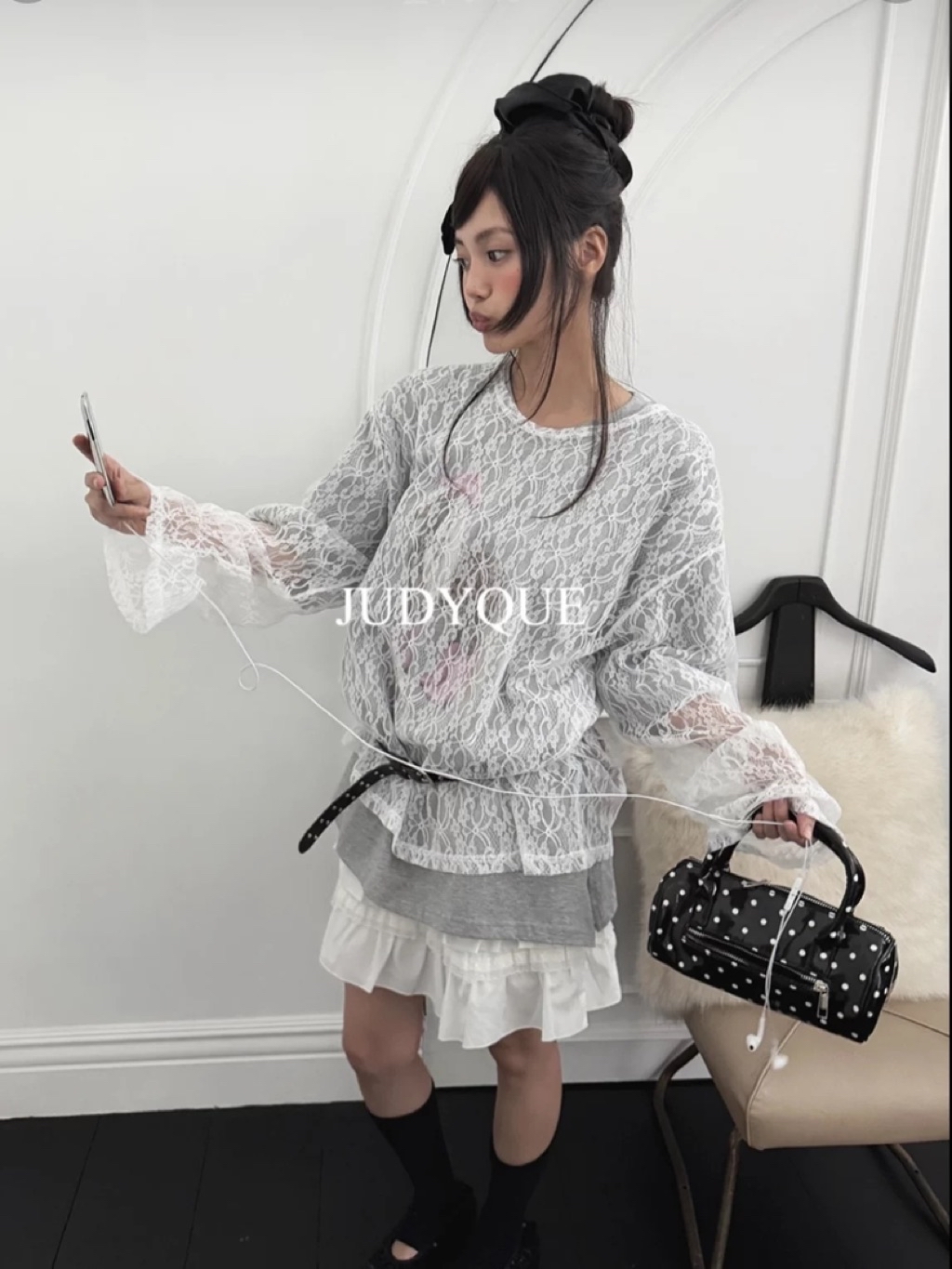 [ 7loong ] 正韓預購 Judyque 26SS春夏 寬鬆喇叭袖造型細緻蕾絲透膚上衣(共2色)