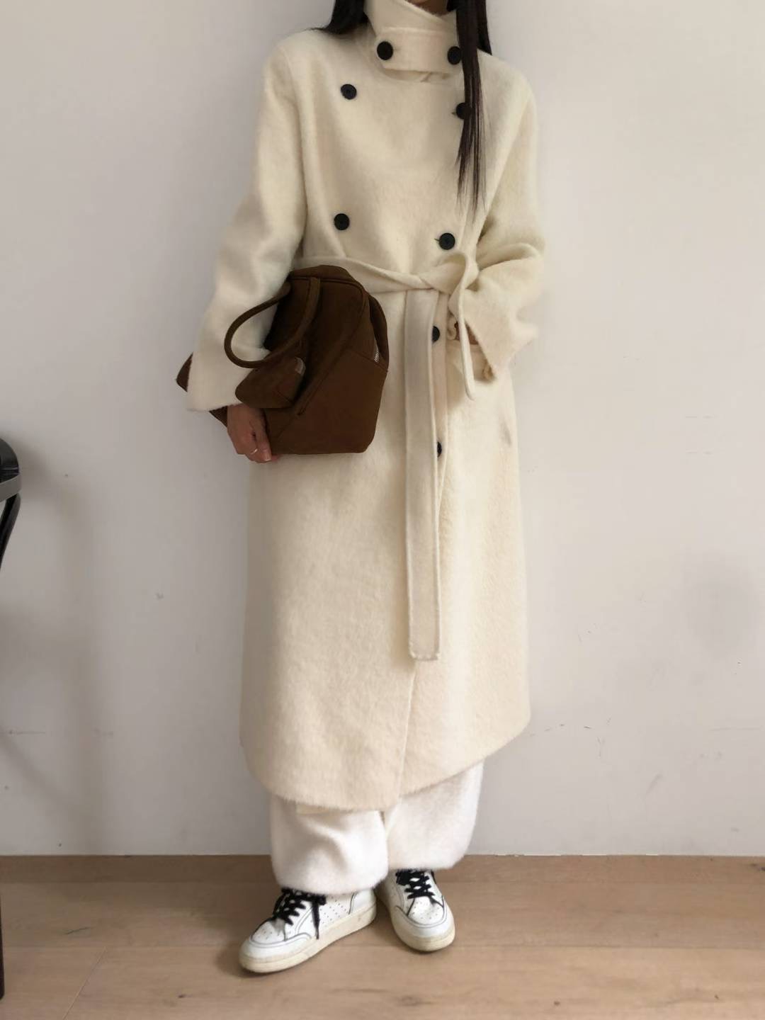 [ 7loong ] 正韓預購 東大門選品 羊毛+羊駝毛手工雙排釦腰帶長版大衣(共3色)