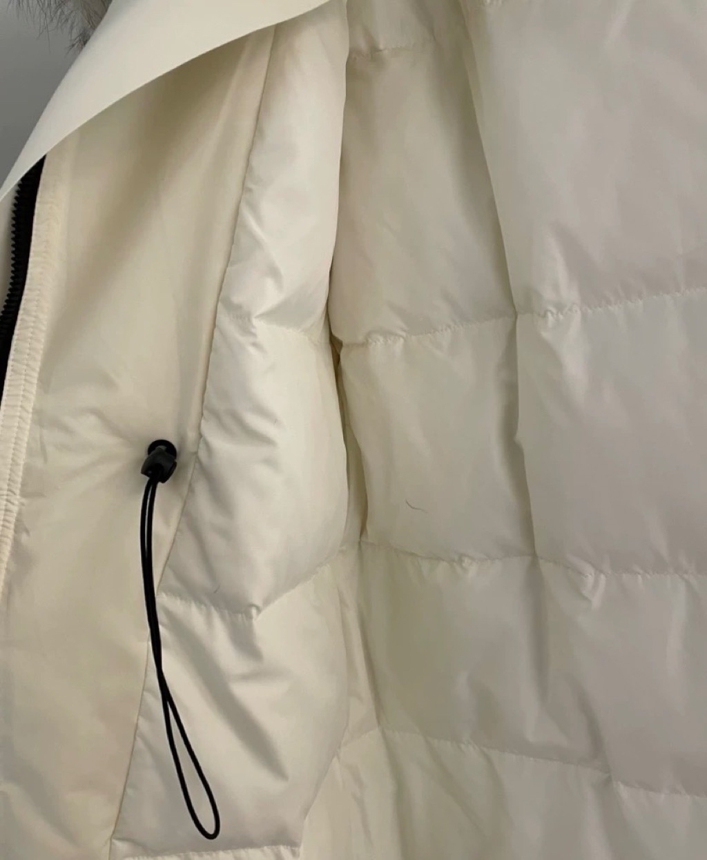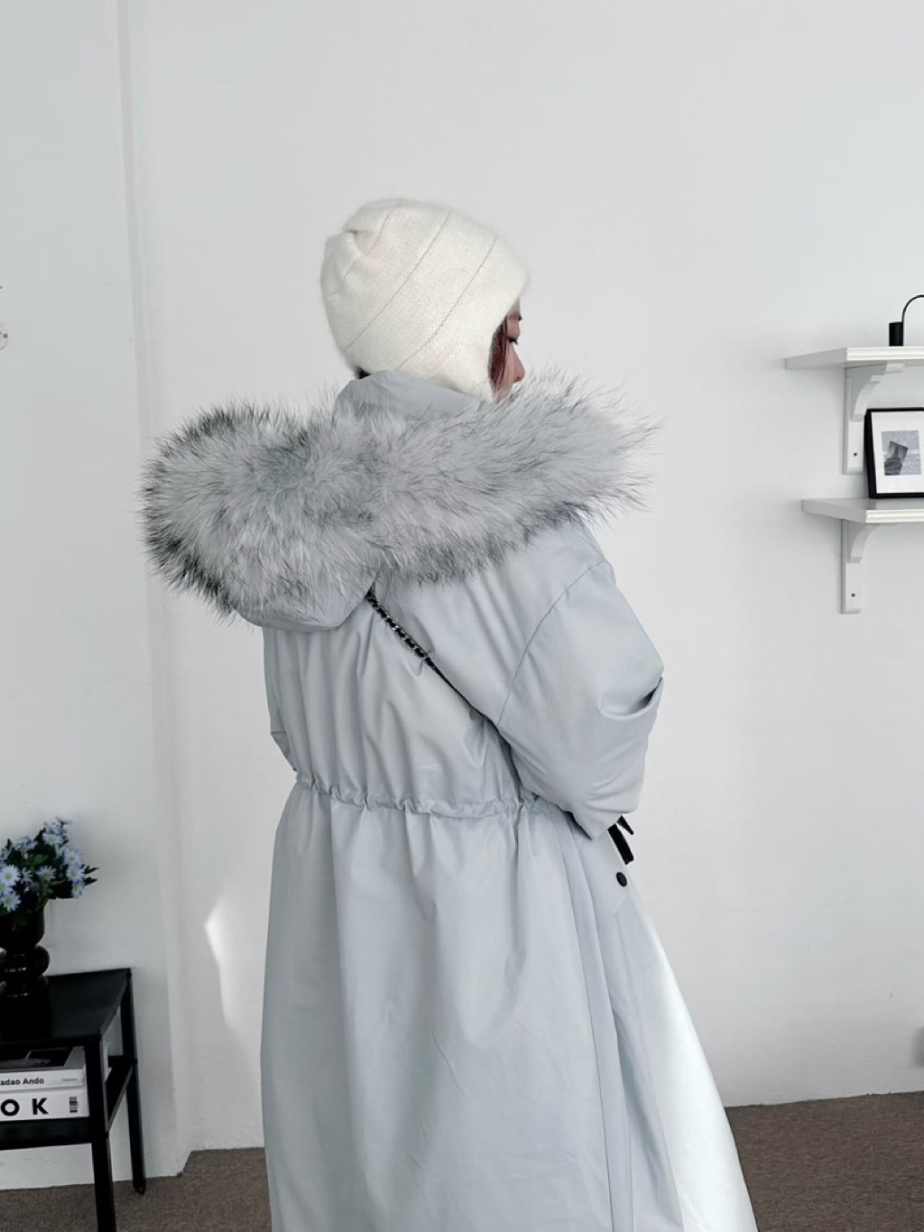 7loong 防潑水面料+長版90%鴨絨超保暖!毛毛是浣熊毛可以拆~有腰部跟下擺束繩、雙向開拉鍊,修飾效果👍