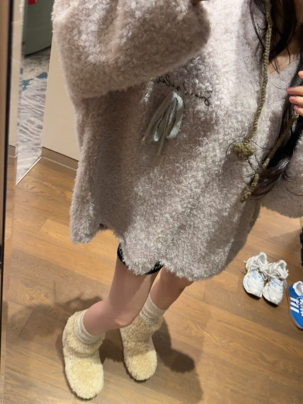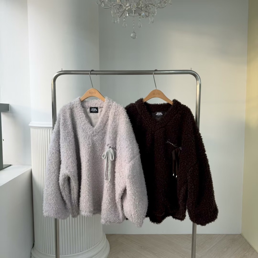 [ 7loong ] 正韓預購 太妍家 25FW秋冬 QQ羊羔毛綁蝴蝶結V領寬鬆衣(共2色)
