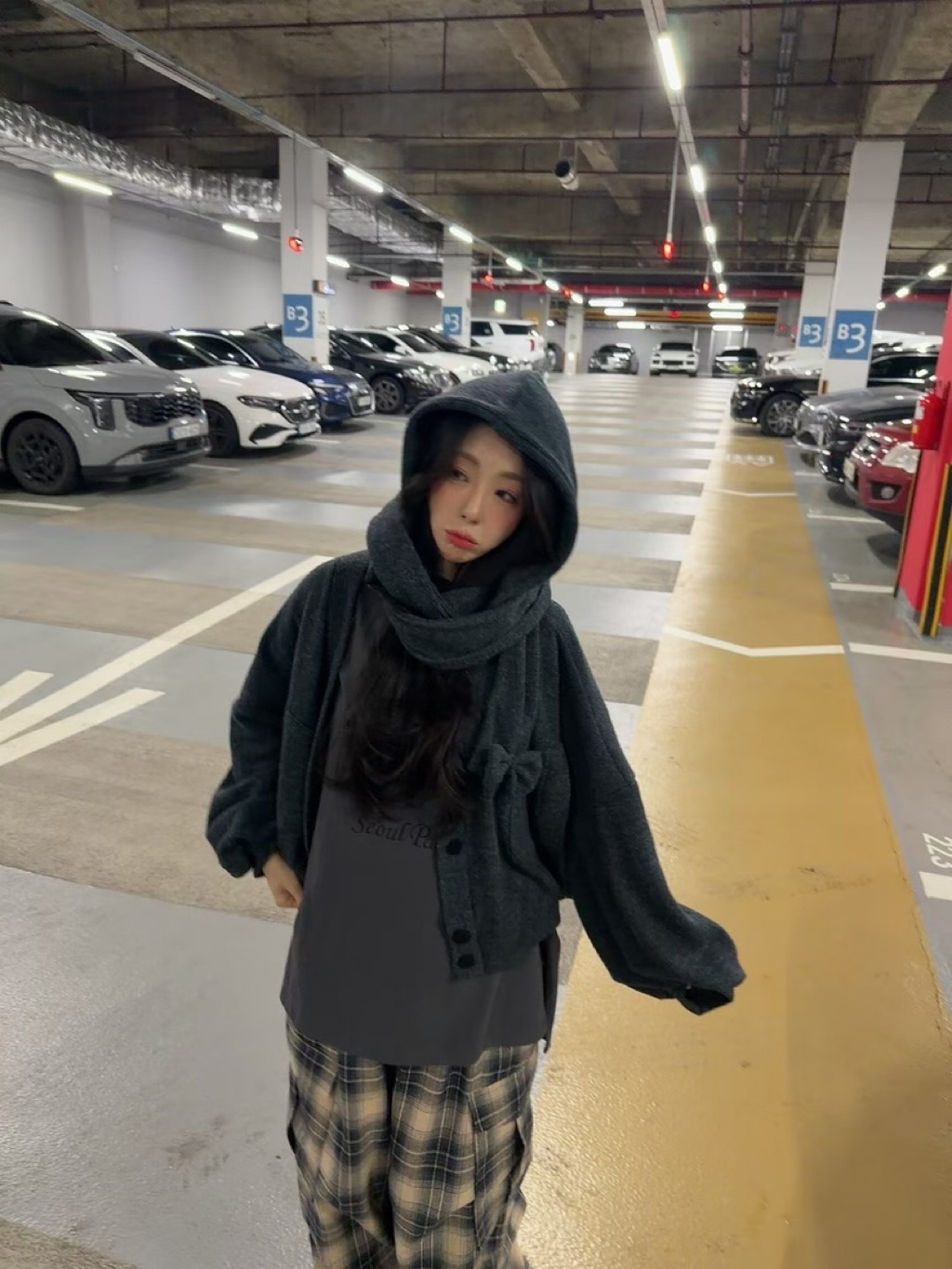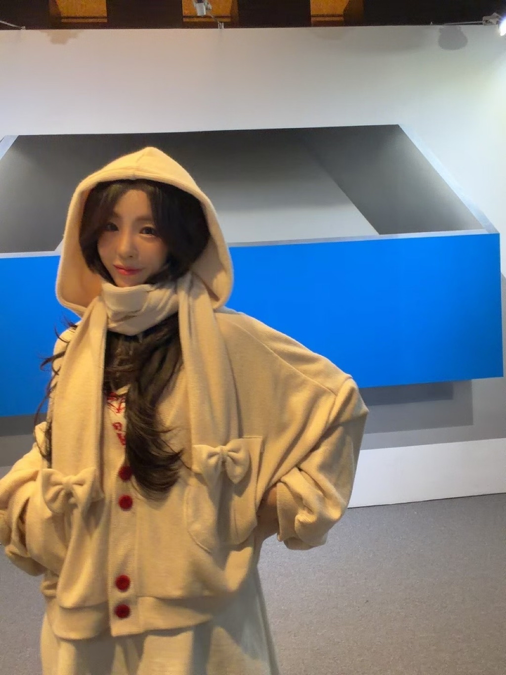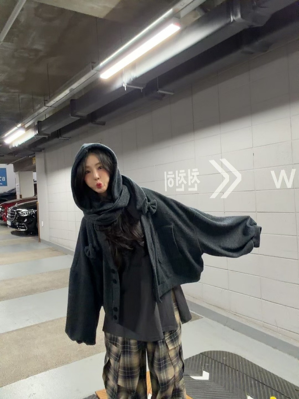 [ 7loong ] 正韓預購 太妍家 25FW秋冬 連帽蝴蝶結圍巾脖圍+寬鬆開釦外套(共2色)