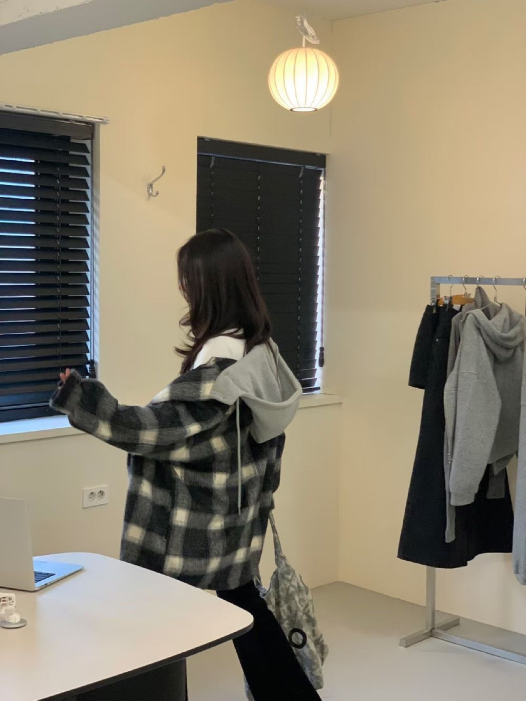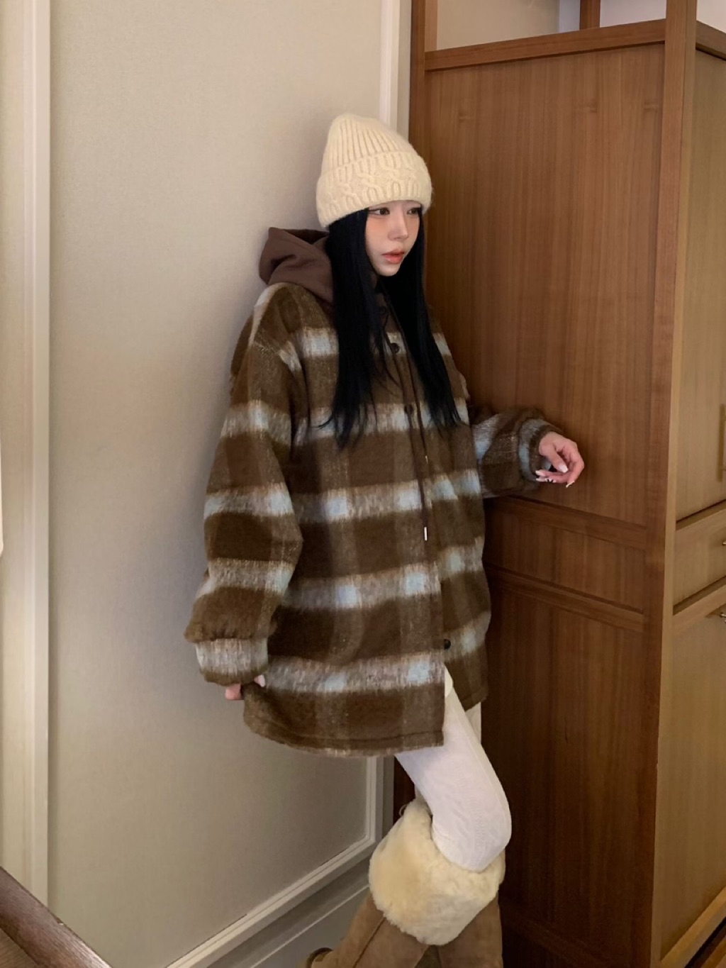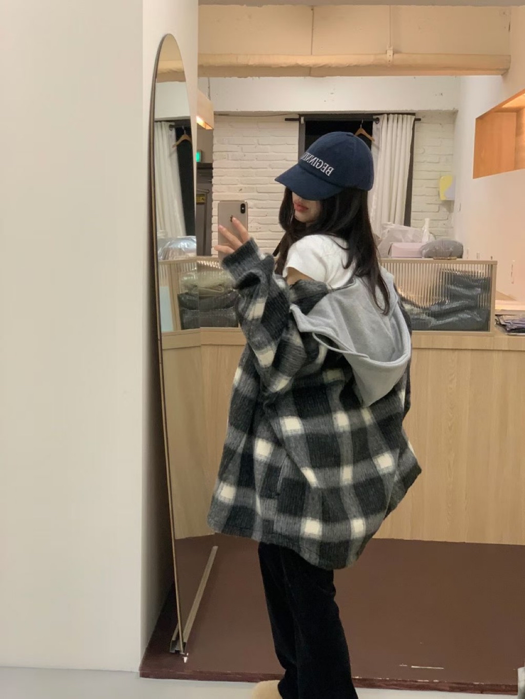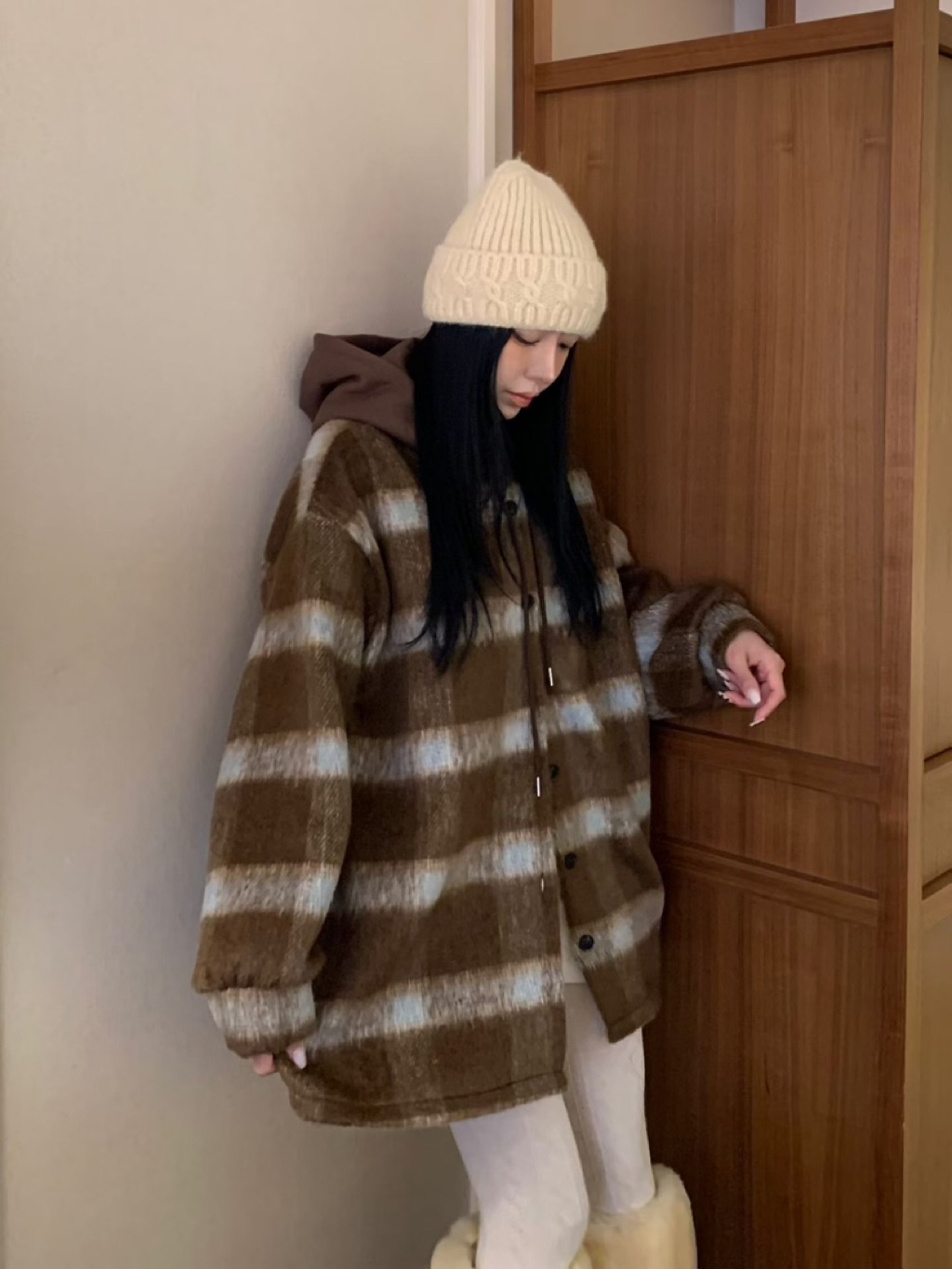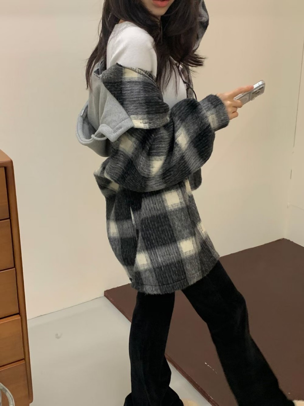 [ 7loong ] 正韓預購 東大門選品 25FW秋冬 混羊毛格紋寬鬆開釦連帽襯衫外套(共2色)