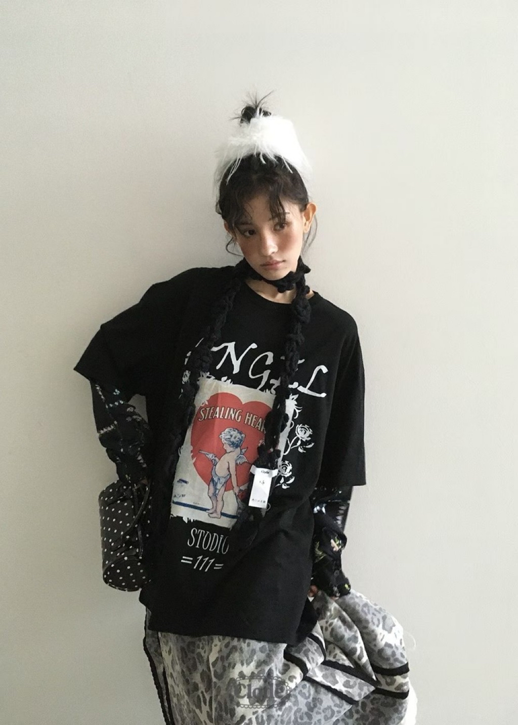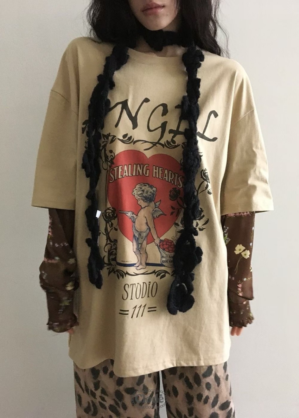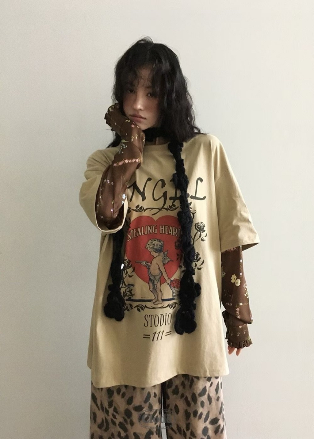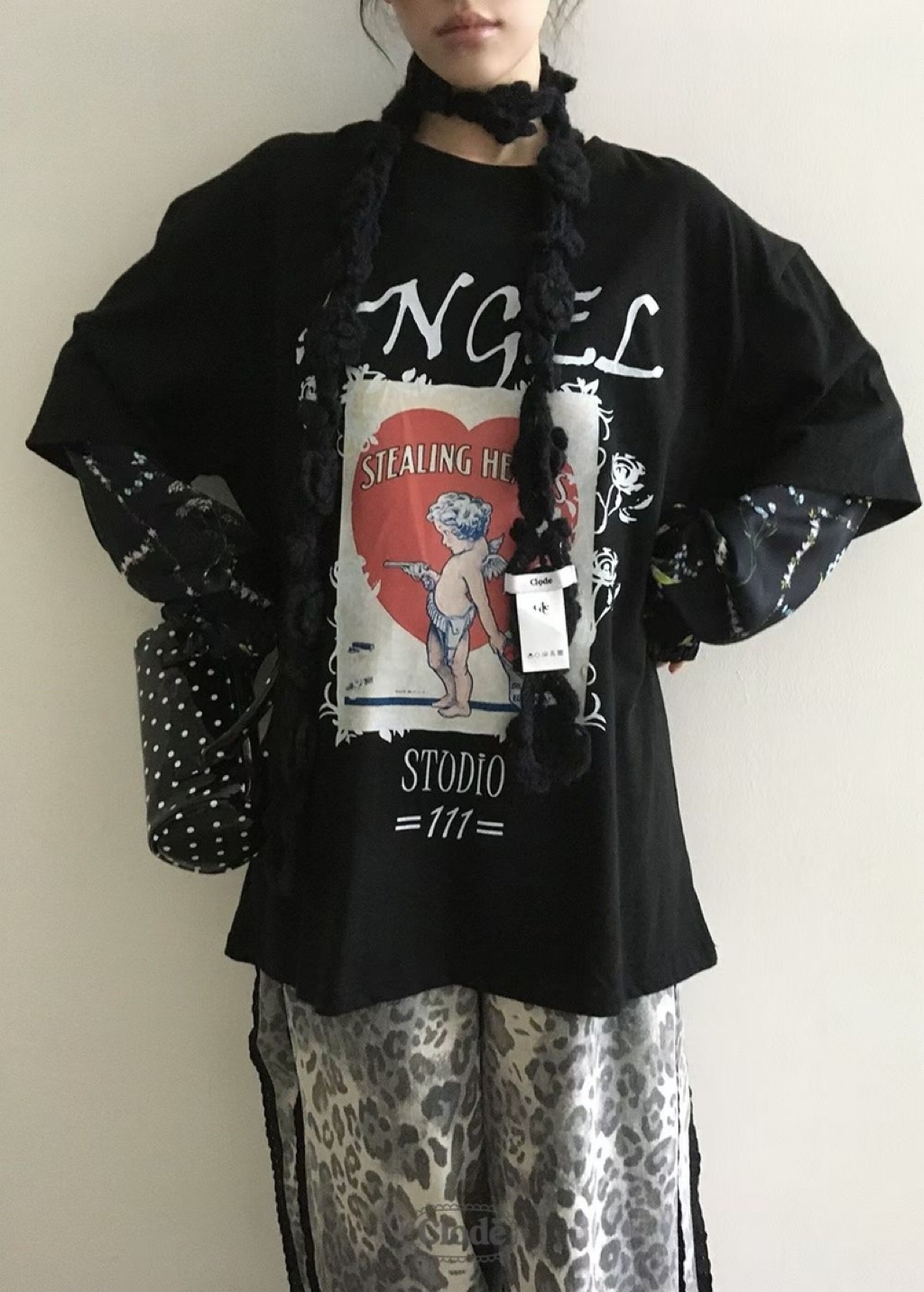 [ 7loong ] 正韓預購 Clode 25FW秋冬 天使圖案拼接印花透膚手袖長版上衣(共3色)