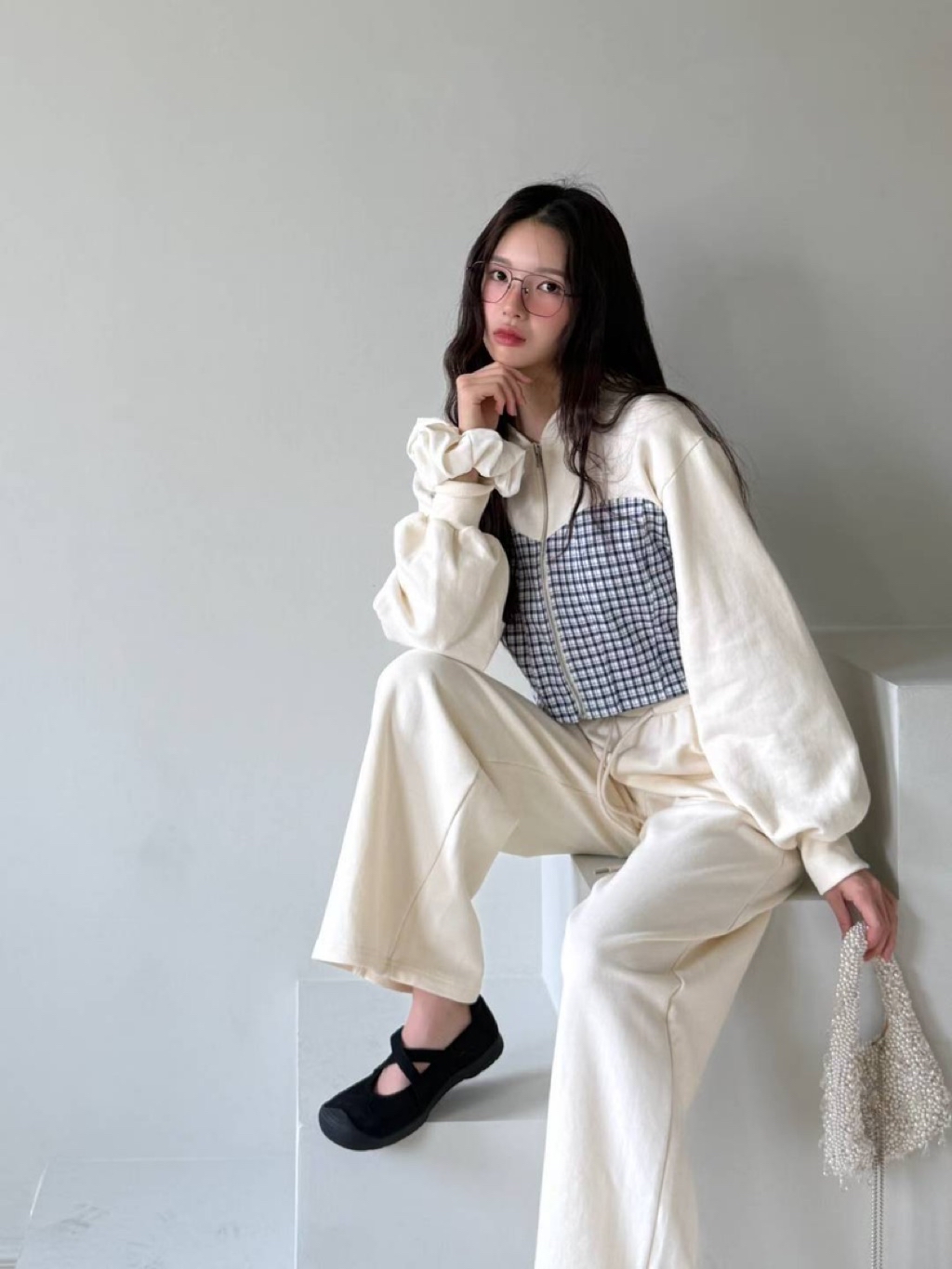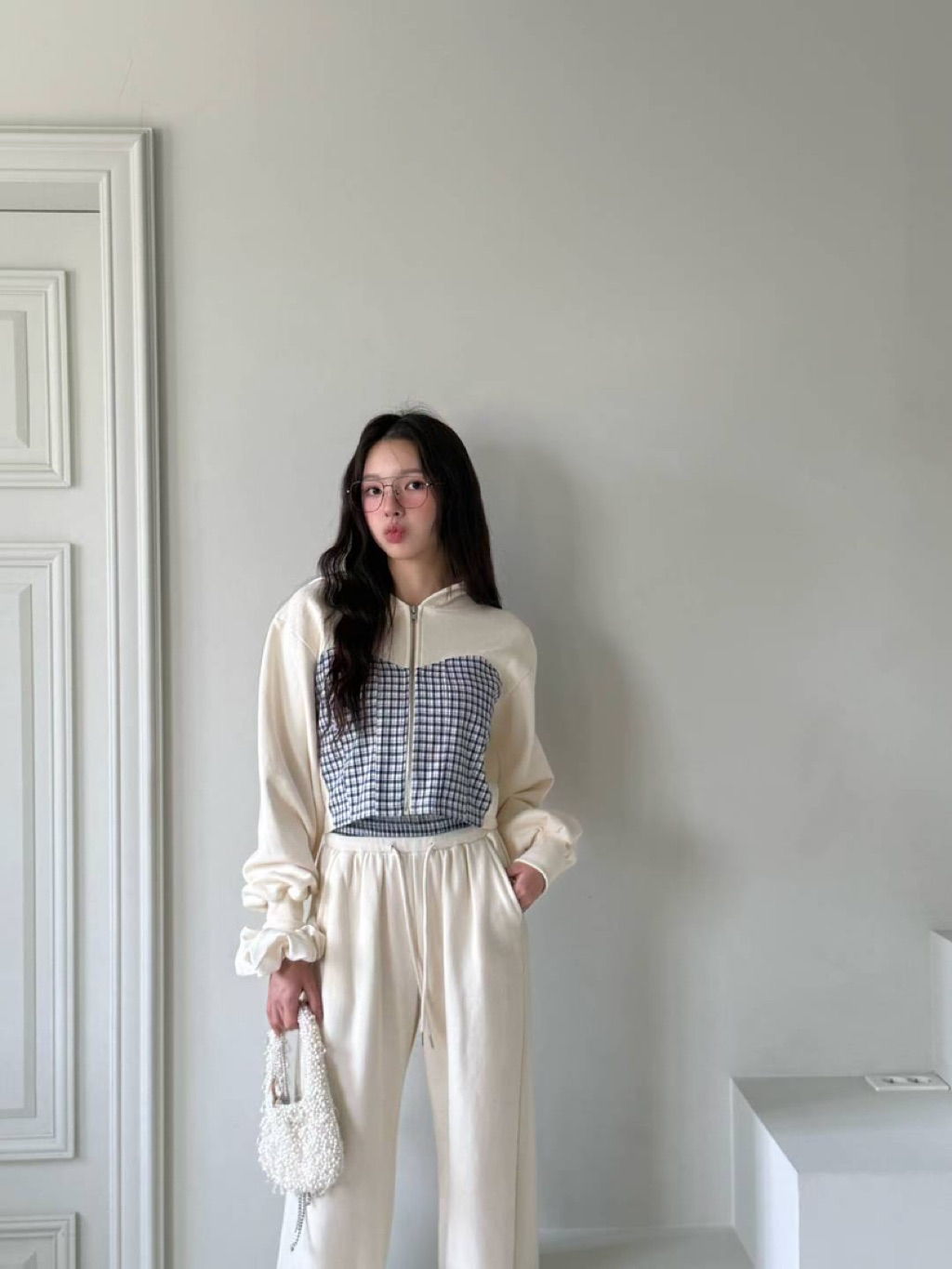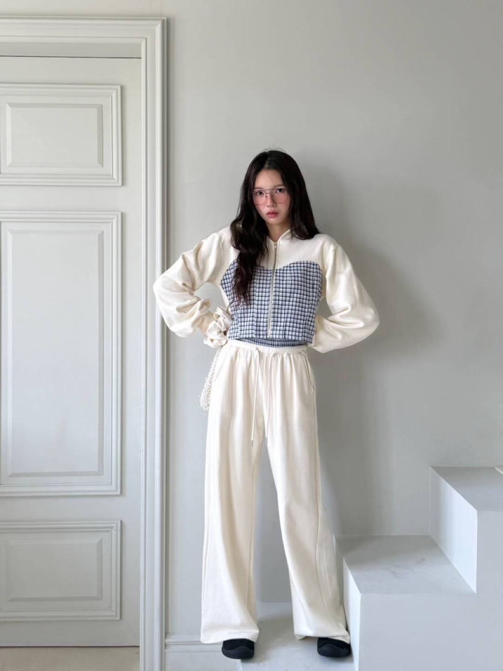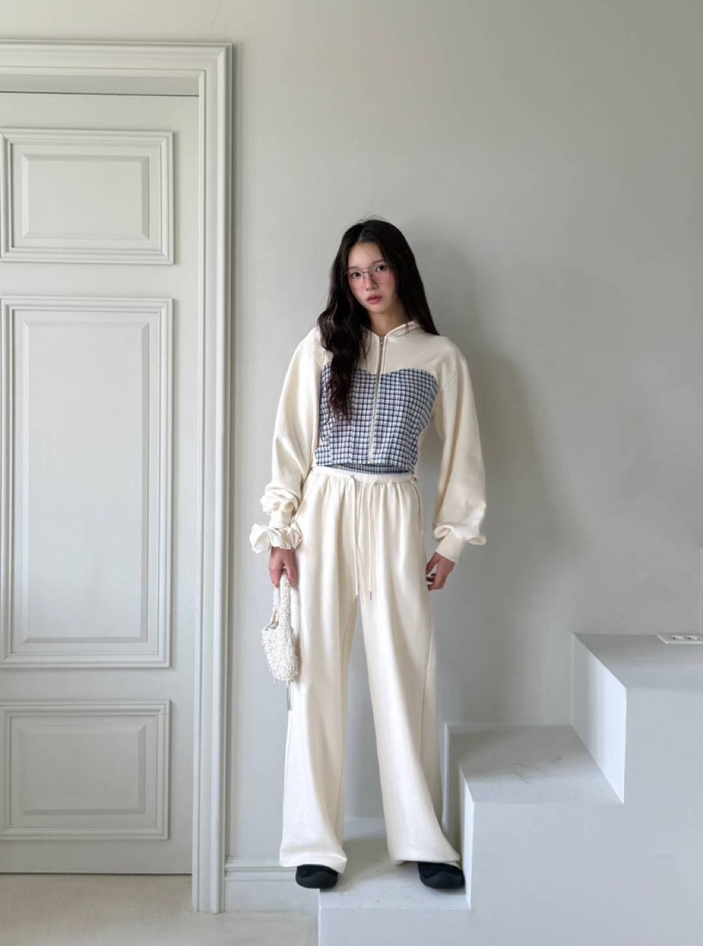 [ 7loong ] 正韓預購 東大門選品 25FW秋冬 細格馬甲拼接短版連帽外套+拼接腰頭長褲(共3色)