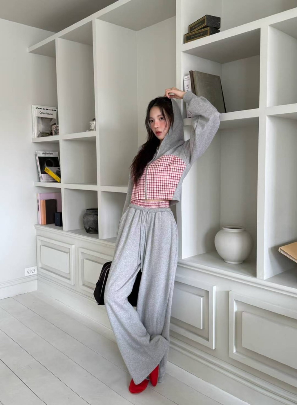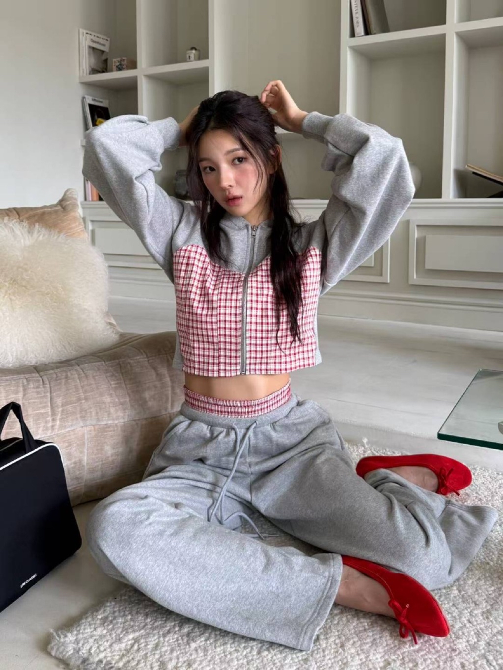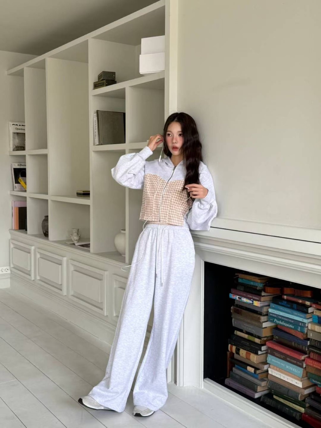 [ 7loong ] 正韓預購 東大門選品 25FW秋冬 細格馬甲拼接短版連帽外套+拼接腰頭長褲(共3色)
