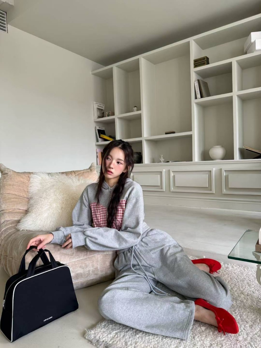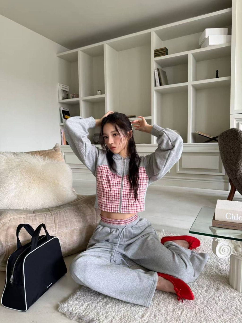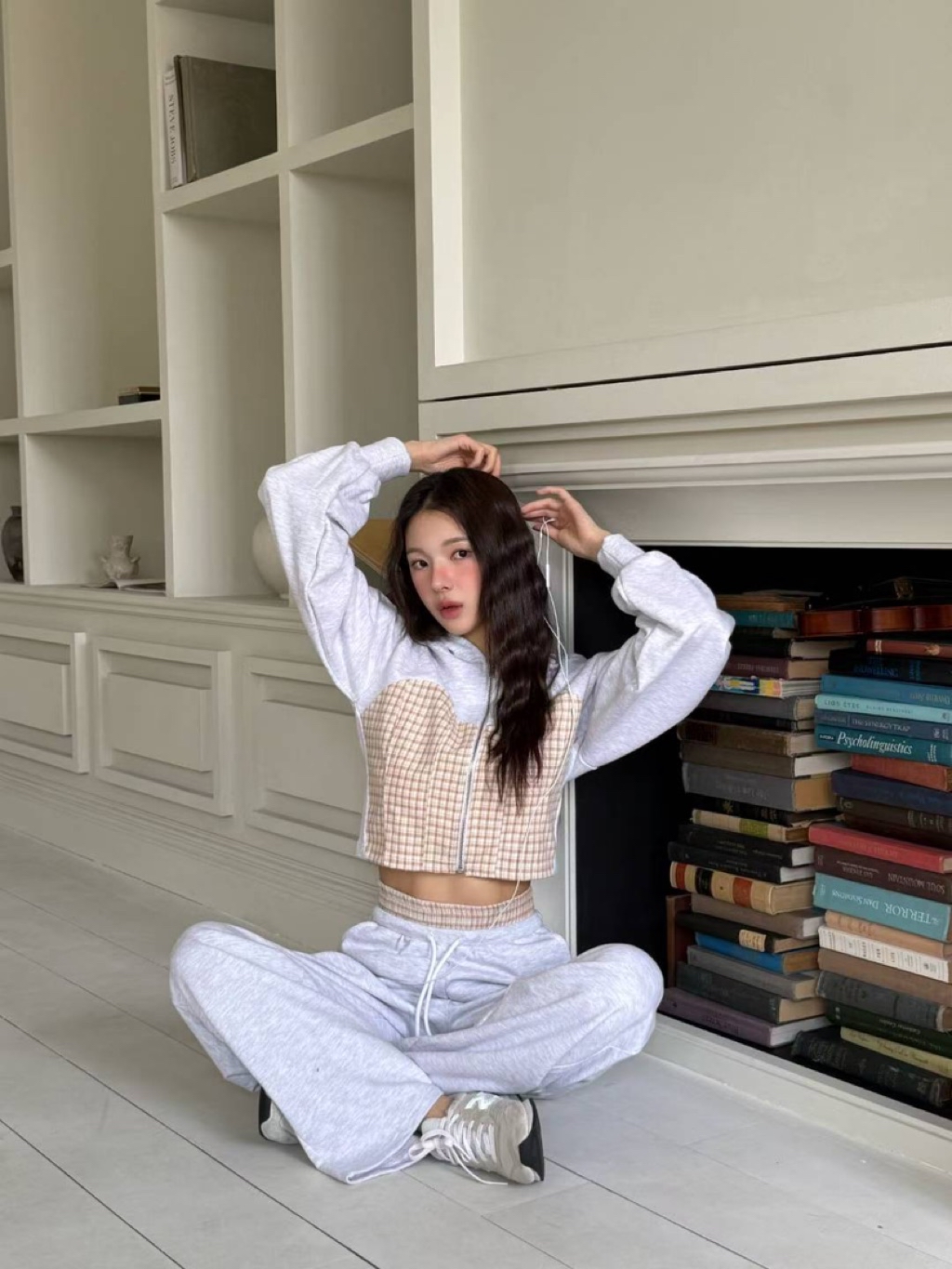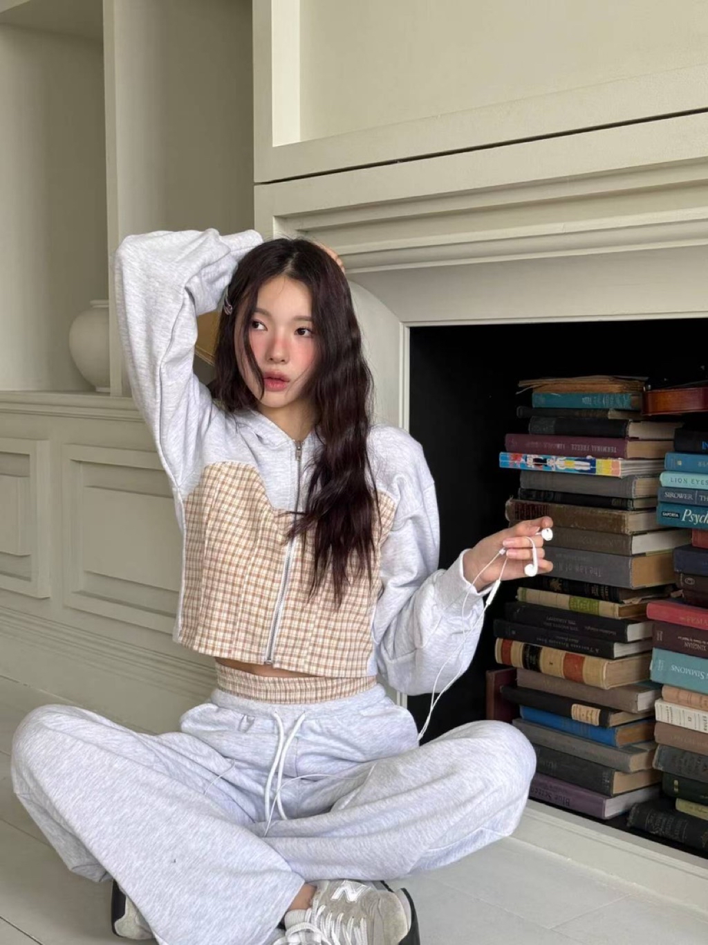 [ 7loong ] 正韓預購 東大門選品 25FW秋冬 細格馬甲拼接短版連帽外套+拼接腰頭長褲(共3色)