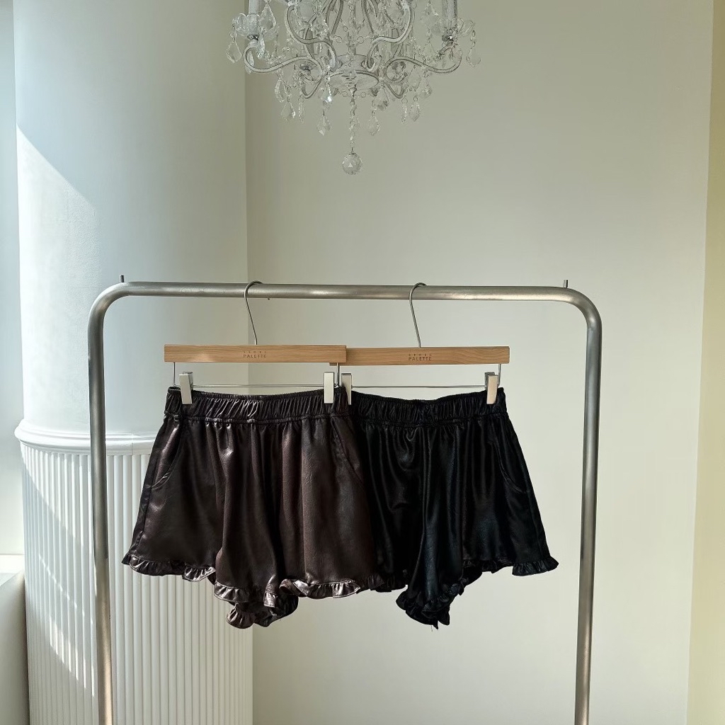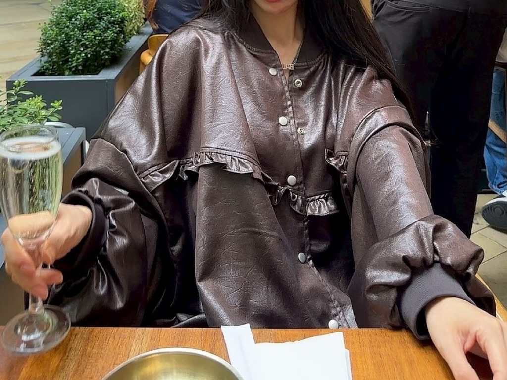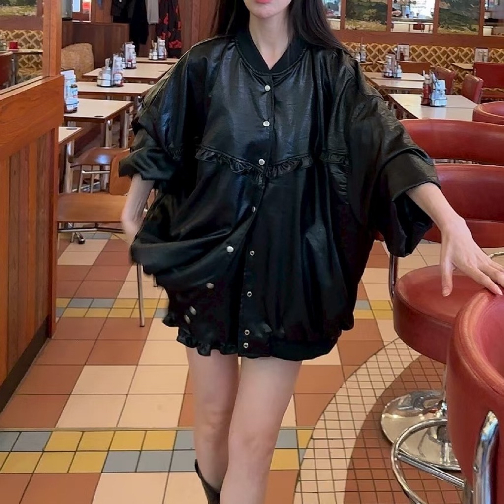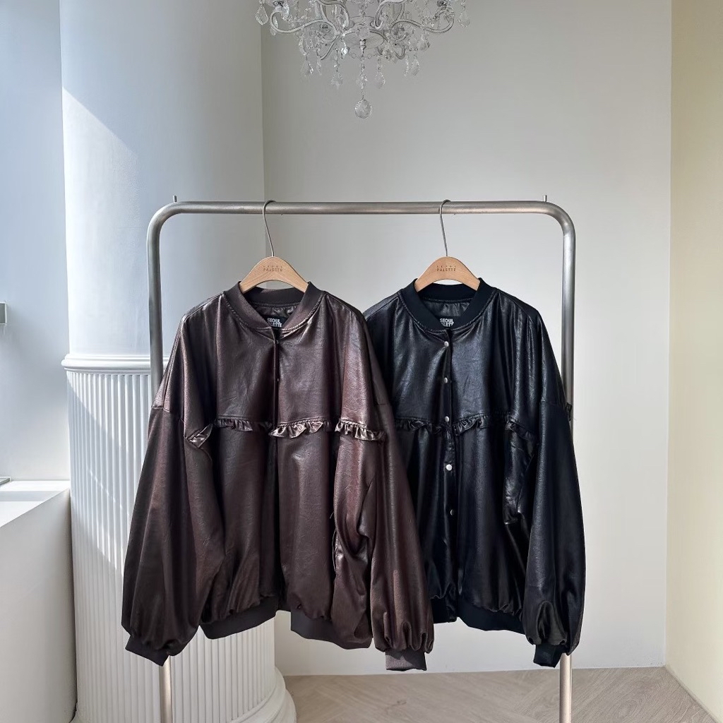 [ 7loong ] 正韓預購 太妍家 25FW秋冬 滾花邊寬鬆澎袖仿皮革棒球外套+仿皮革花邊下擺短褲(共2色)